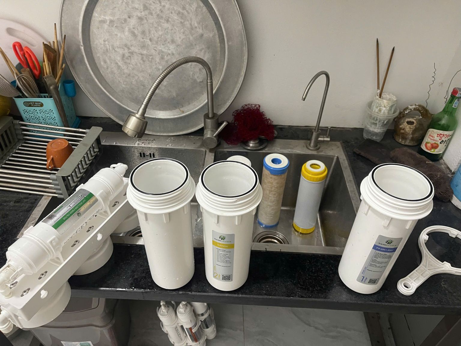 Chú ý thứ tự các lõi lọc và cách tháo lõi để áp dụng cho bước lắp lõi lọc mới. Sau đó, tiến hành rút 3 lõi cũ ra và vệ sinh lại cốc đựng lõi.